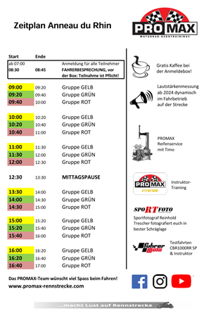 Die Online-Anmeldung Anneau du Rhin ersetzt nicht den PROMAX Haftungsverzicht, den zu zusätzlich vor Ort unterschreiben musst. Wir sind bei den Boxen am Rennstreckeneingang und haben auch deine Startnummer und den Gruppenaufkleber vorbereitet.